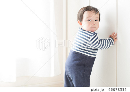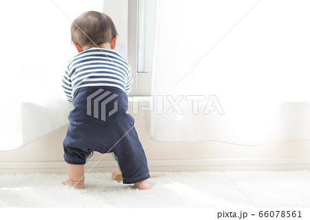 嬰兒手牽手站著的後視圖(男孩,9 個月大,1 歲,日本)