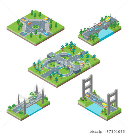 Bridge isometric set. 3d isolated drawing elements of a modern urban infrastructure for games or applications. Bridge across the river isometric icon. Element infographic