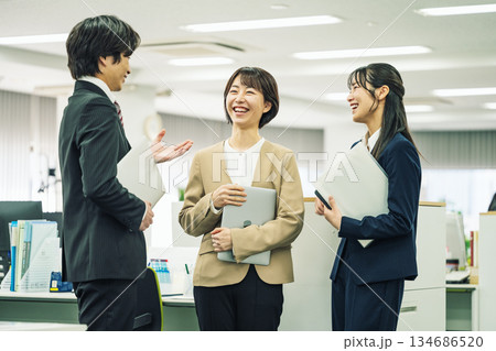 工作場所的溝通:商務團隊站在許多女性的工作場所交談