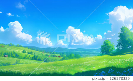 清爽的夏日草原風光,動漫風格