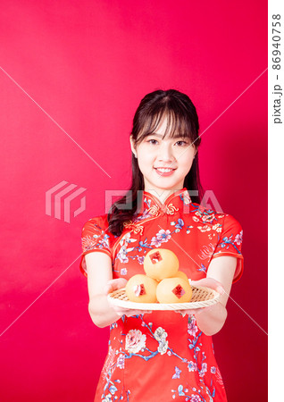 旗袍傳統旗旗袍婦女紅色背景由 Maeki Ichiban Pear 撰寫,頂部粘貼由邀請寶費春慶祝新年撰寫。