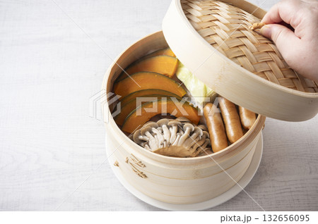 竹蒸籠放在鍋子上進行蒸煮的示意圖