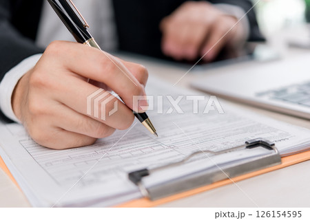 Business and financial paperwork verification featuring a close-up of hands working on a contract. Ideal for corporate, investment, and legal consulting.