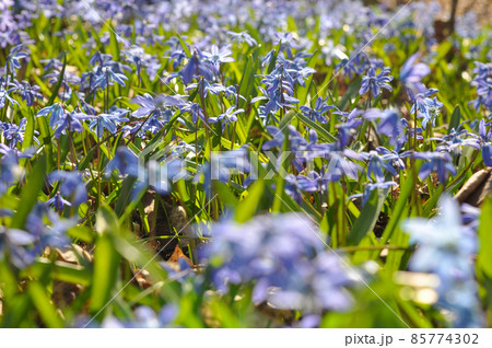 Spring sunny day in forest. First tender wild snowdrops, primroses in snow