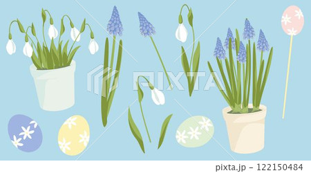 grape hyacinth and snowdrop in pot, blossoming tree branches, easter eggs, elements for creating easter greeting cards, posters and backgrounds