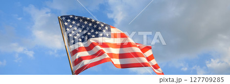America flag wave under blue sky in celebration of the nation holiday for 4th of July, Memorial Day, Independence Day and celebrate victory with copy space on top with blue sky outdoor background