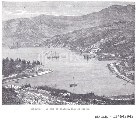 Dalmatia Bay Scene At Gravosa Near Ragusa With Ships, Hills, And Village
