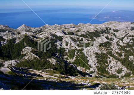 View of the Biokovo mountain range of the Dinaric Alps from Makarska riviera, Adriatic coast of Croatia