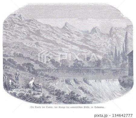 Dalmatian Landscape With River Source, Mountains, And Rural Figures By The Shore
