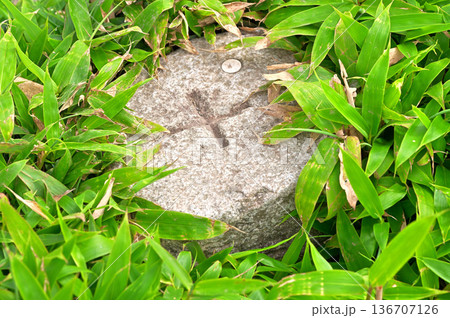 伊豆半島,伊豆山脊步道,達摩山頂,埋在竹草中的一級三角測量點標誌