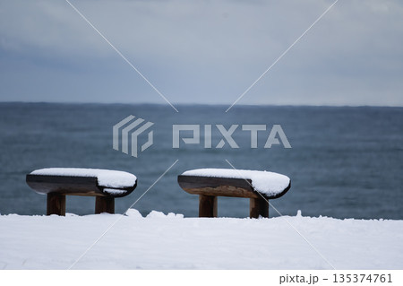 陽光明媚的冬天大海和雲朵:海浪在陽光下閃閃發光,海邊有一張長椅。