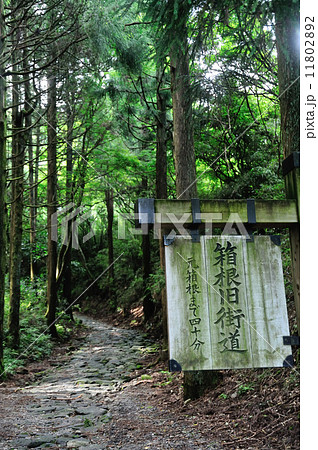 箱根町箱根舊高速公路石板路、徒步旅行者和石板路結構信息板