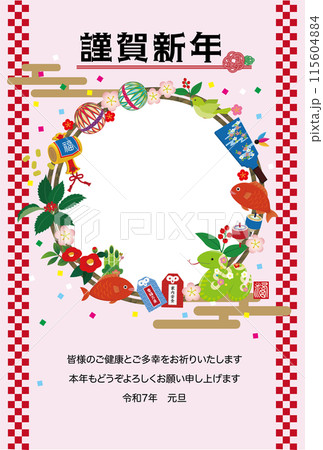 新年賀卡<明信片模板,蛇年,2025,令和7,櫻花,水平位置,垂直文字,新年快樂>