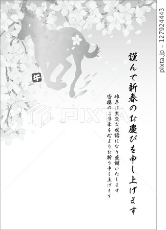 新年賀卡<明信片模板、馬年、2026年、令及8年、櫻花、橫寫、橫寫、新年快樂、黑白、水墨畫>