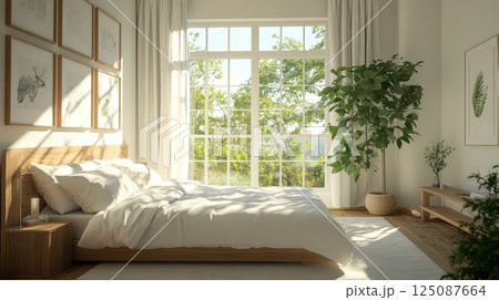 Sleep wellness. Bright and serene bedroom with natural light, wooden furniture, and green plants creating cozy atmosphere