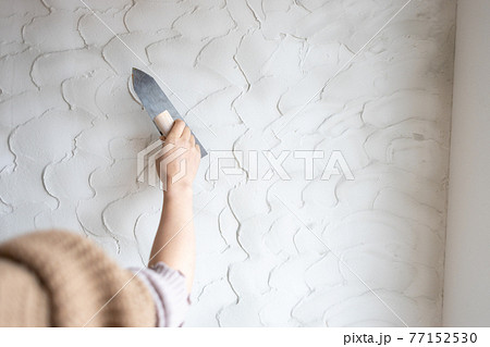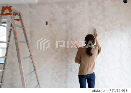 一位年輕女子正在用矽藻土粉刷一棟在建的新獨戶住宅的牆壁