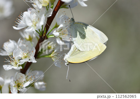 李子樹盛開的白花和交尾的蝴蝶