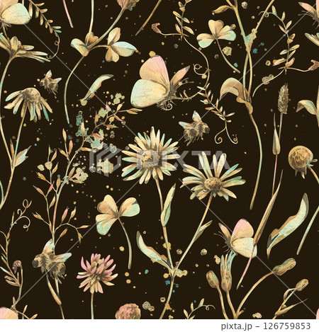 Elegant seamless dark pattern of hand-painted meadow flowers and herbs in soft watercolor tones. Ideal for packaging, wallpapers, fabric design, and gentle romantic spring or summer themes.