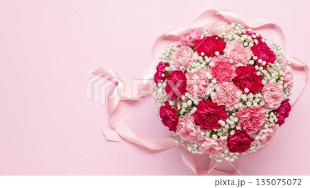 母親節圖片,粉紅色背景的紅色康乃馨和絲帶