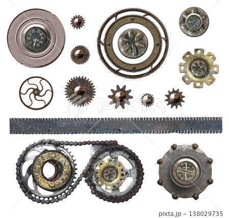 Vintage nail, gear, speedometer, inclinometer collection. Set of retro steel rusty rivet hardware, old screw, metal plate, bolt for industrial and steampunk design. Isolated on white background