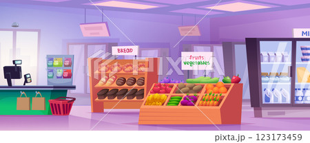 Grocery mall. Interior set of different grocery products in shopping mall exact vector cartoon background