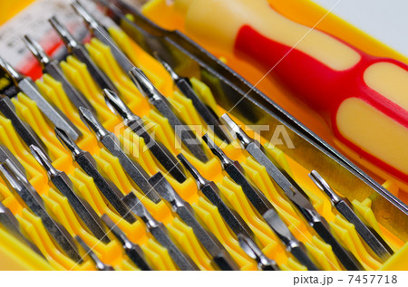A screwdriver with different bits in a box on a white surface. The screwdriver handle is gray, and the case is black.