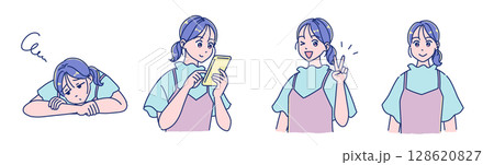 勤奮工作的女性辦公室職員的一組情緒,卡通風格