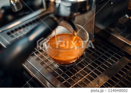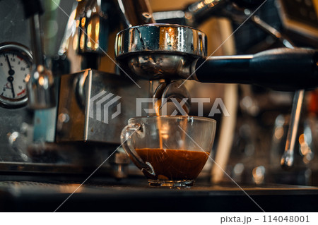 A shot of coffee flows into a glass from a coffee machine in a coffee shop.