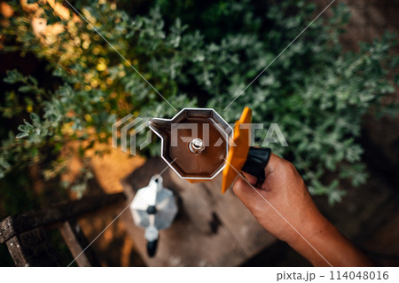 Refreshing iced black coffee in a glass with moka pot on a rustic wooden table.