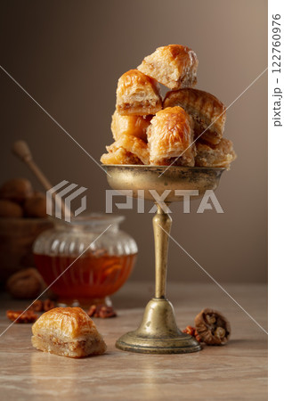 Indulgent Turkish Dessert Display, Featuring Syrup-Soaked Pastries like Sekerpare and Kadayif