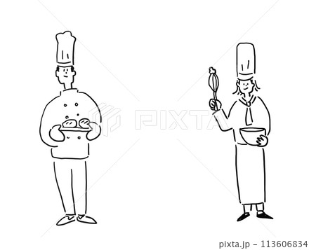 一個戴著廚師帽的男人拿著麵包,一個穿著圍裙的女人拿著攪拌器