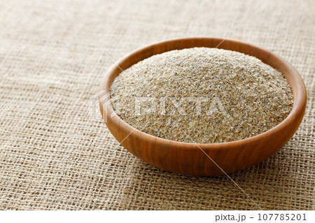 Oat flakes in wooden bowl isolated on white background with full depth of field. Top view. Flat lay