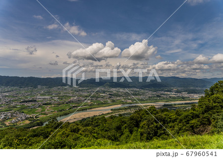 從七月夏天的奇諾川市的寺山空中運動看的和泉山風光