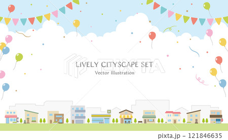 街景中排列著簡單的商店和房屋,背景是氣球、花環和五彩紙屑。 16:9 尺寸向量圖