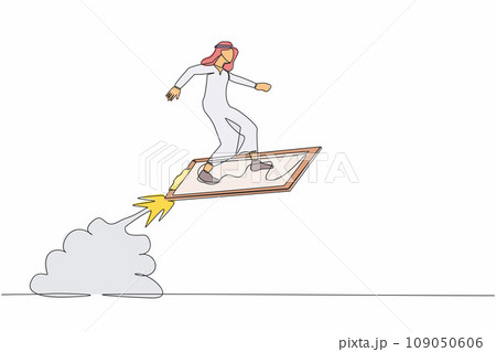 Single continuous line drawing Arabian businessman riding clipboard rocket flying in the sky. Analyze data at launch of new startup. Business contract. One line draw graphic design vector illustration
