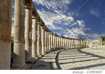 Forum (Oval Plaza) in Gerasa (Jerash), Jordan. Was built in the first century AD. Against the background of a beautiful sky with clouds.