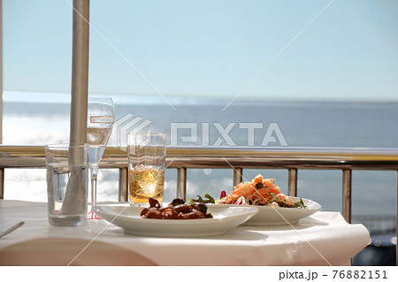 海濱意大利餐廳的露台座位、起泡酒和開胃菜。