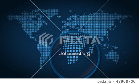 Magnifying glass searches and finds the city of Johannesburg on dotted world map. 3D rendering