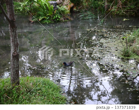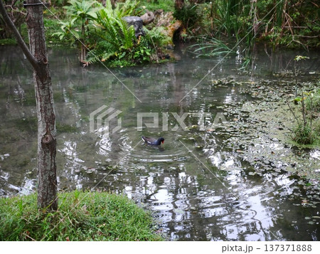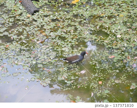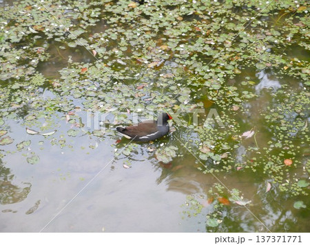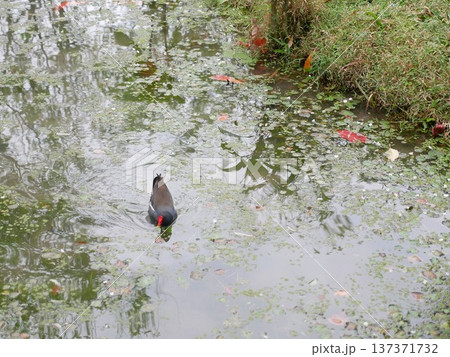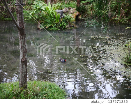 公園濕地沼澤裡覓食的紅冠水雞亞種成鳥