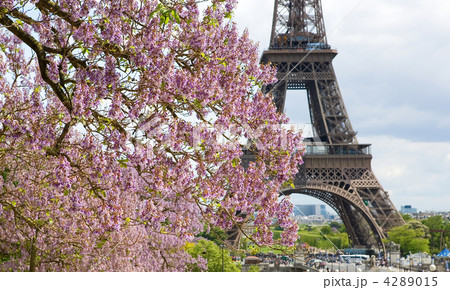 Spring in Paris. Blossoming jacarandas and the Eiffel Tower. Foc