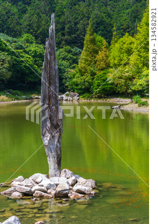 綠色的高山湖泊背景,綠色的山路,湖中枯樹的地標