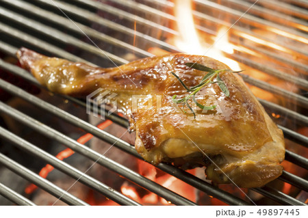 在煙燻炭火烤架上烤雞腿