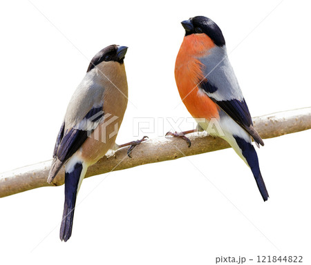 Two little birds perching on branch isolated on white background. Male and Female common bullfinch