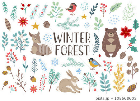 Winter forest floral and animals design elements