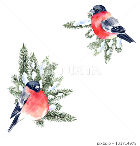 Watercolor illustration of two bullfinches on snowy pine branch with festive winter background
