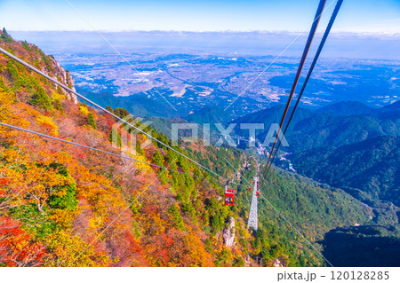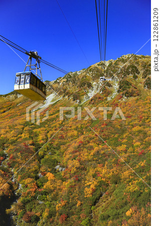 立山黑部藍天下的美麗秋葉和索道
