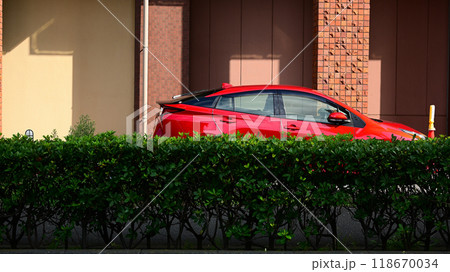 紅色汽車和城市風景
