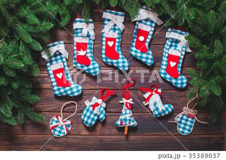 Christmas socks of different colors for gifts are hanging on the fireplace with decorations. Christmas atmosphere