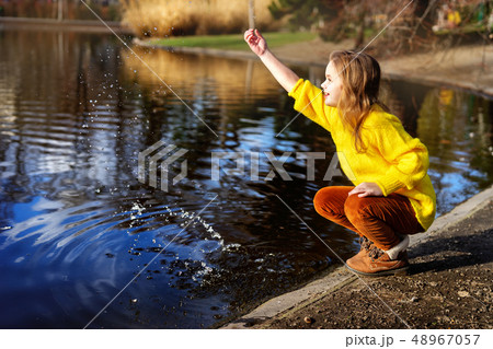 Happy child girl in bright yellow sweater paying with water outdoors