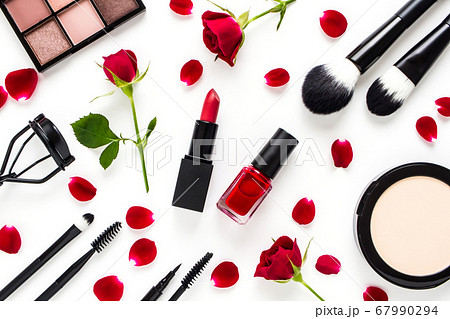 化妝品紅玫瑰和化妝品白色背景